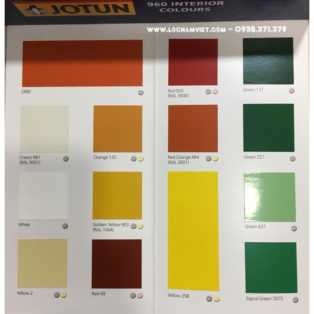 Màu sắc: Ivory White 566, Yellow 414, Orange 436, Yellow 258, Red 967 (Ral 3000), Ral 1004, Red 49, White, Black, Ral 3013, Tomato Red 2079, Ral 2001, Yellow 2, Green 137, Signal Green 7075, Ral 6032, Green 431, Green 437, Blue 139, Blue 599, Blue 129, Grey 38, grey 136, Grey 403, Light grey 967, Ral 7035, grey 433, grey 149, grey 456, ral 7000, ral 5002, ral 5005, ral 6000, ral 6001, ral 6011, ral 1003, ral 1015, ral 3020, ral 8017, ral 9001.
