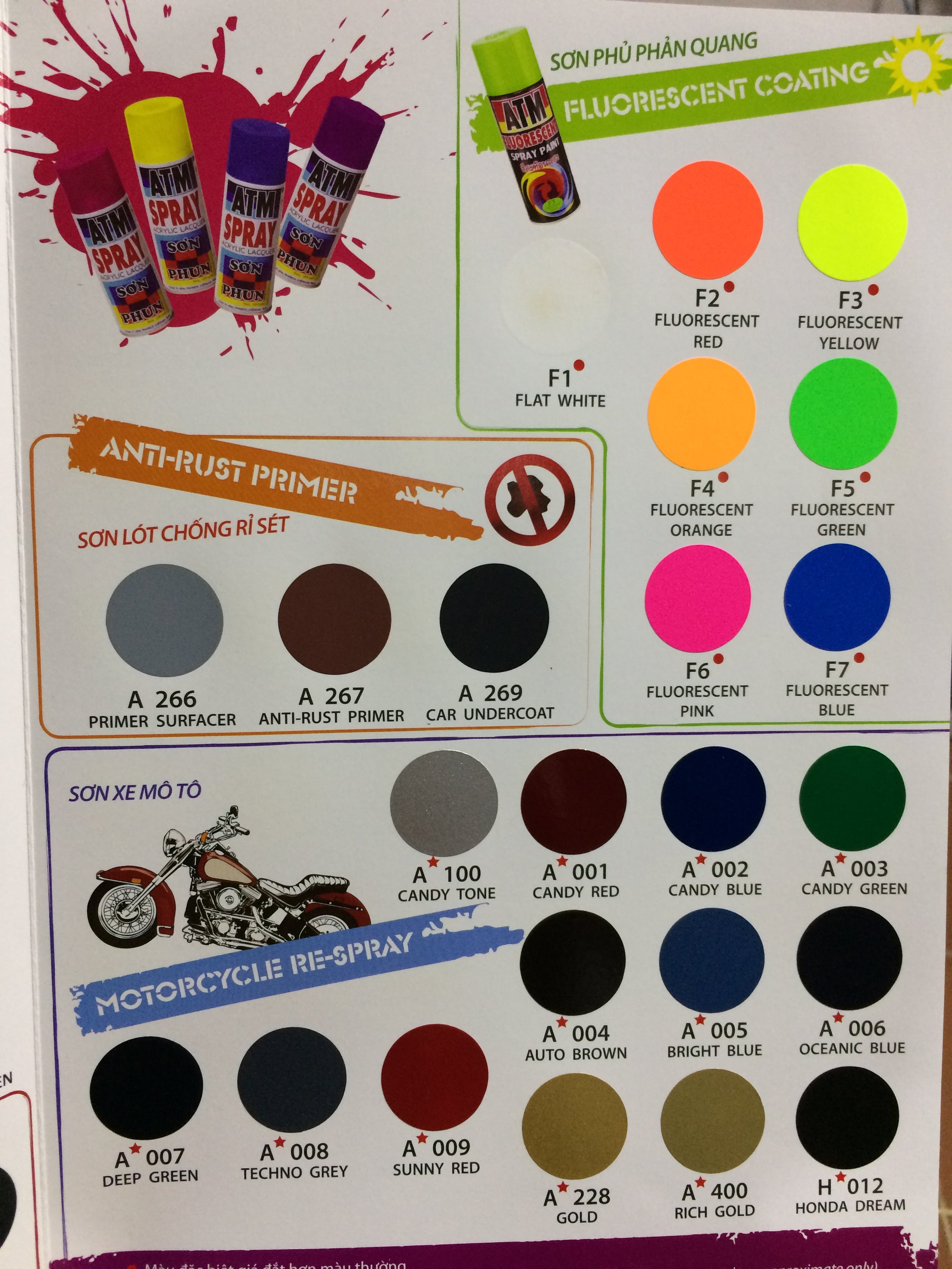 SƠN PHUN “ATM” ACRYLIC:Đặc chế từ hỗn hợp nhựa N/C và ACRYLIC, được đóng gói dưới dạng bình xịt cầm tay rất tiện dụng, dùng sơn để trang trí cho các bề mặt bằng gỗ và kim loại như: đồ gia dụng, bàn, ...- Giao hàng toàn quốc