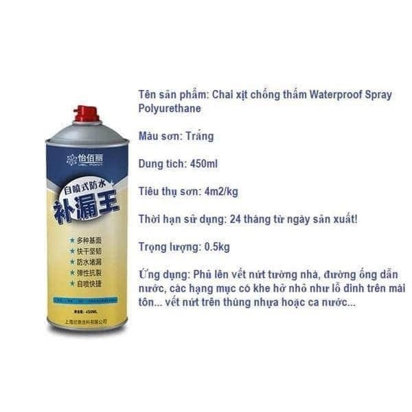- Bình xịt chống thấm sử dụng được trên các vật liệu khác nhau như: nhựa, bê tông, đá Marble, tường xi măng, gạch men, mái ngói, tôn, vết nứt giữa hai vật liệu khác nhau…