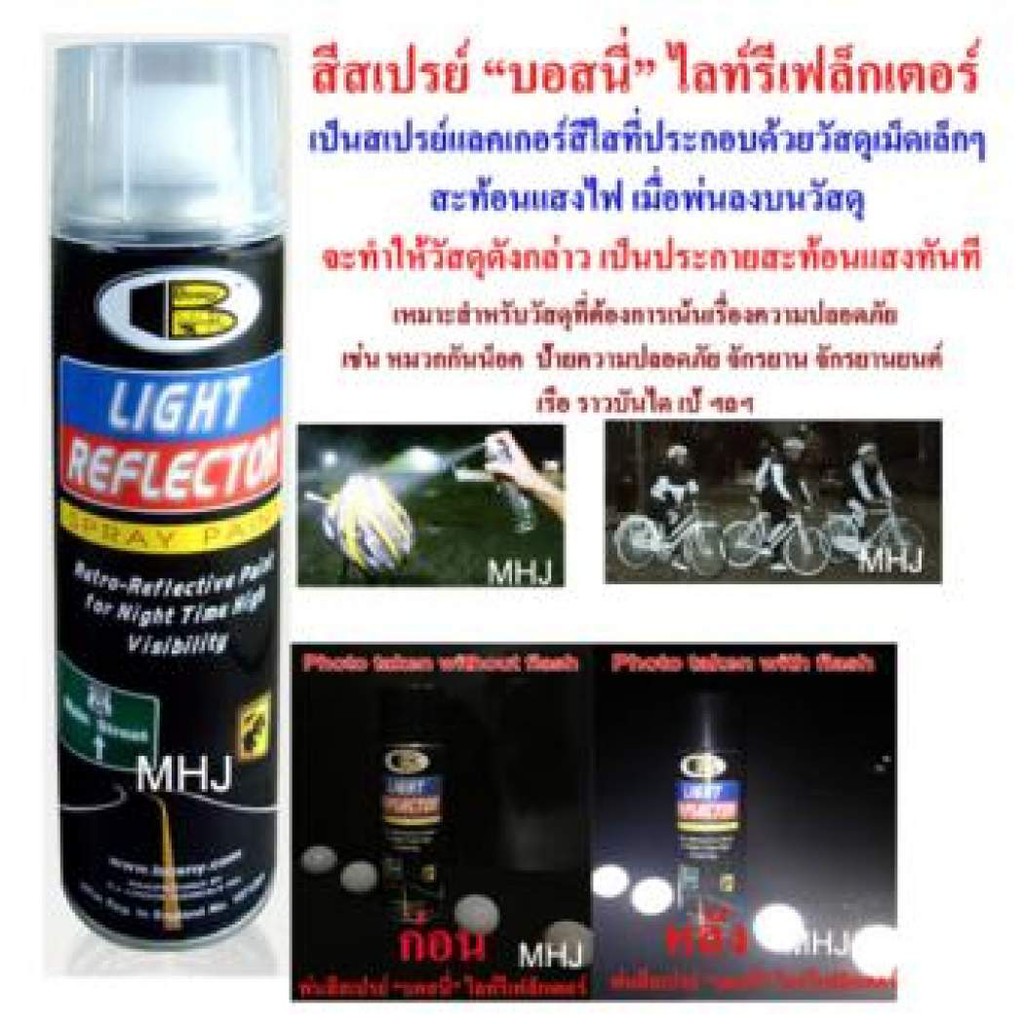 Sơn trong suốt , không màu, nên sơn lót màu mong muốn trước khi sơn Bosny Light ReflectorỨng dụng thực tế : Có tác dụng phản chiếu ánh sáng rực rõ vào ban đêm khi có đèn chiếu vào, thường được dùng trong biển báo, vách ngăn, biển số, biển chỉ dẫn , đường dẫn xuống hầm xe .....