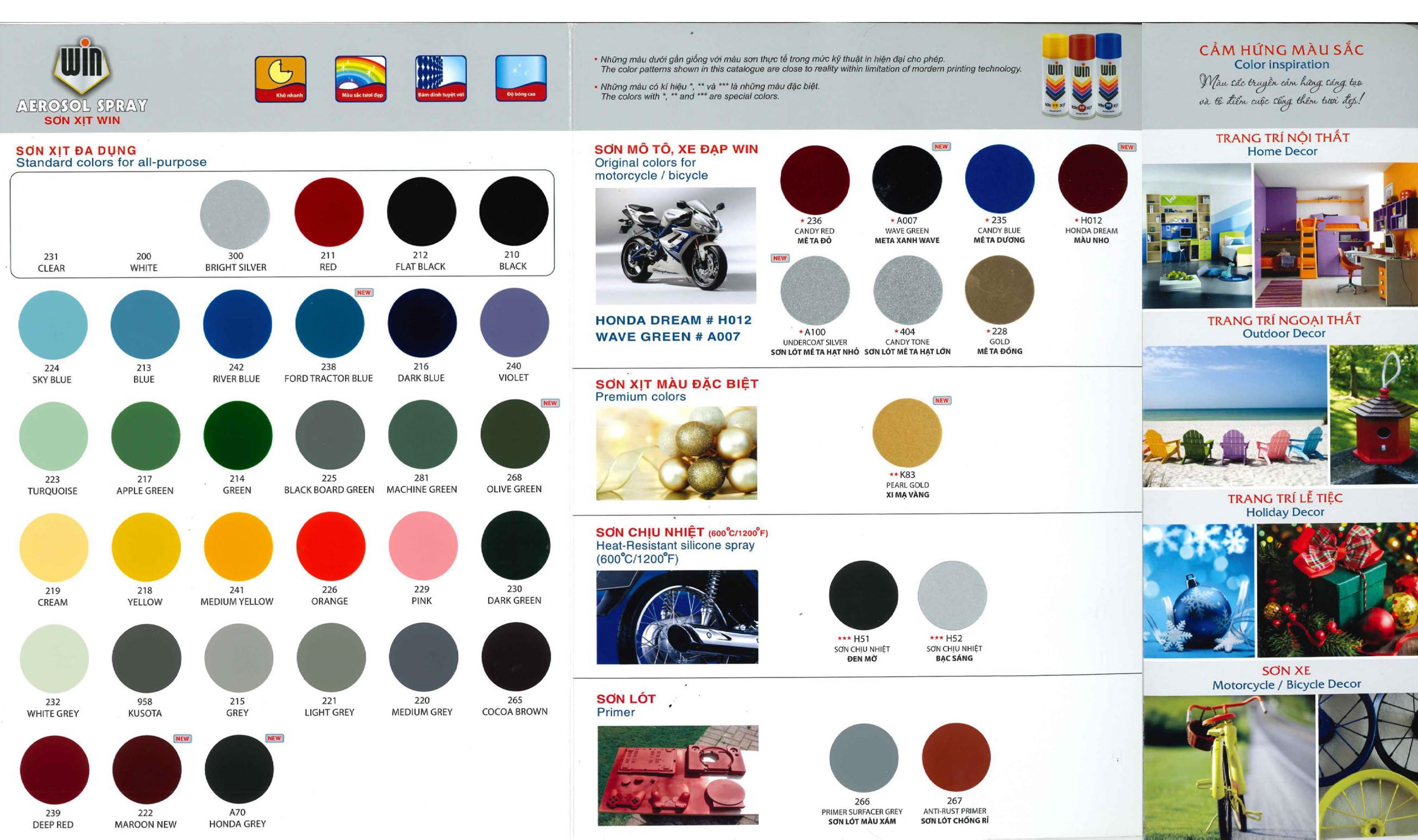 Sơn xe mô tô, xe máy, xe đạp WIN: Màu mêta đỏ candy red 236; màu meta xanh wave green A007; màu meta xanh dương candy blue 235; Màu nho dream H012; Sơn nhũ bạc meta hat nhỏ undercoat silver A100; sơn nhũ bạc mê ta hạt lớn candy tone 404 màu candy green 234; màu mêta đồng gold 228.
