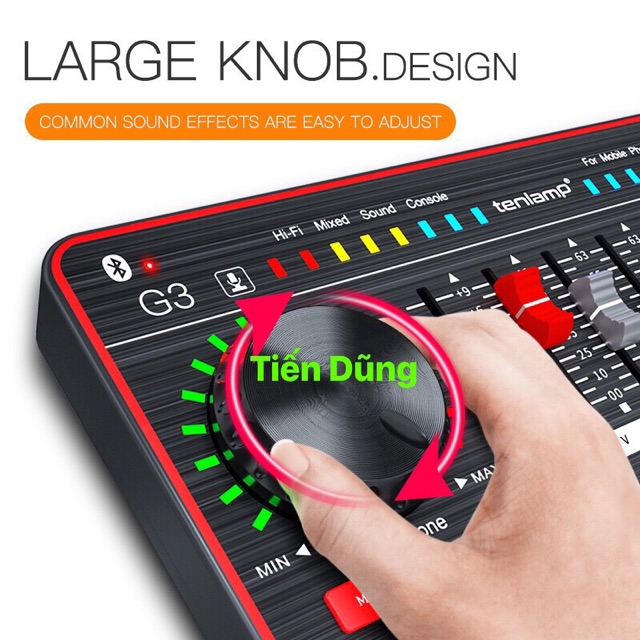 Sound Card G3 đầy ấn tượng với thiết kế quá chuyên nghiệp và đẹp mắt, với 2 nút vol nhạc + vol mic thiết kế như nút vặn trên bàn chỉnh âm thanh của mấy bạn jd, hàng nút gạt cũng được làm giống với nút gạt trên bàn mixer chuyên nghiệp. Khi bật nguồn hàng đèn với đầy mùa sắc nhìn rất bắt mắt thật sự ấn tượng bởi thiết kế của SoundCard G3.