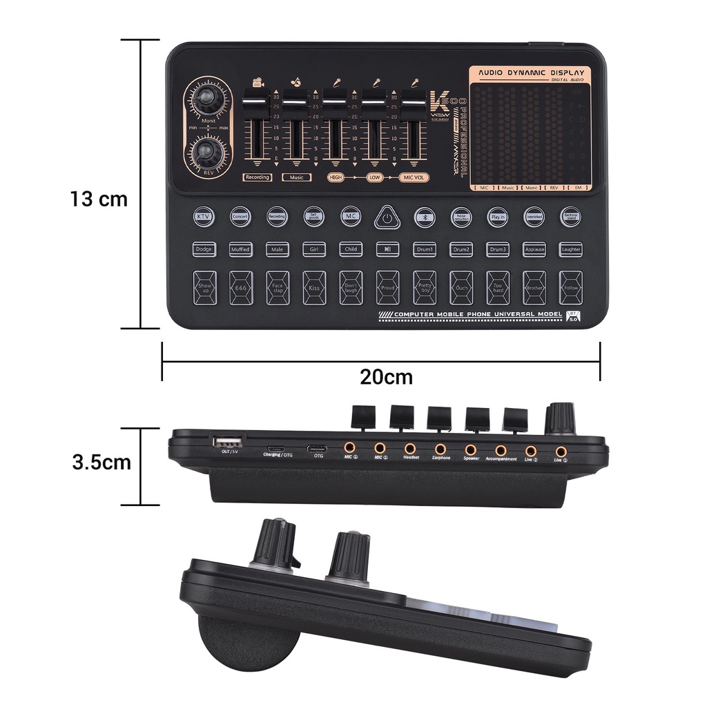 - Sound Card này được tích hợp chip kỹ thuật số DSP lõi kép có thể chuyển đổi nhiều chế độ, hỗ trợ micro kép, phát sóng trực tiếp kép, tai nghe kép.