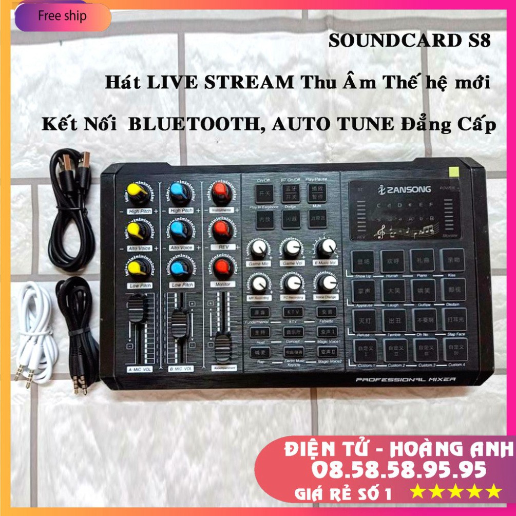 _ Đồng bộ tốt với PC laptop qua cổng USB Soundcard S8 phiên bản tiếng anh có sự cải tiến vượt trội hơn hẳn so với các dòng Soundcard chuyên dụng như v10.h9.k10 ..... dùng để hát karaoke, hát livestream qua mạng xã hội hoặc được trang bị cho phòng thu âm chuyên nghiệp với chất lượng âm thanh tốt hơn. Ngoài ra soundcard hỗ trợ đầy đủ các tính năng nổi bật như hiệu chỉnh Auto-Tune, giả giọng, giả giọng người già, trẻ em… Đặc biệt S8 còn trang bị kết nối Bluetooth không dây dễ dàng với điện thoại phát nhạc karaoke giúp cho việc thao tác chọn bài hát tiện lợi hơn dù ở khoảng cách xa.