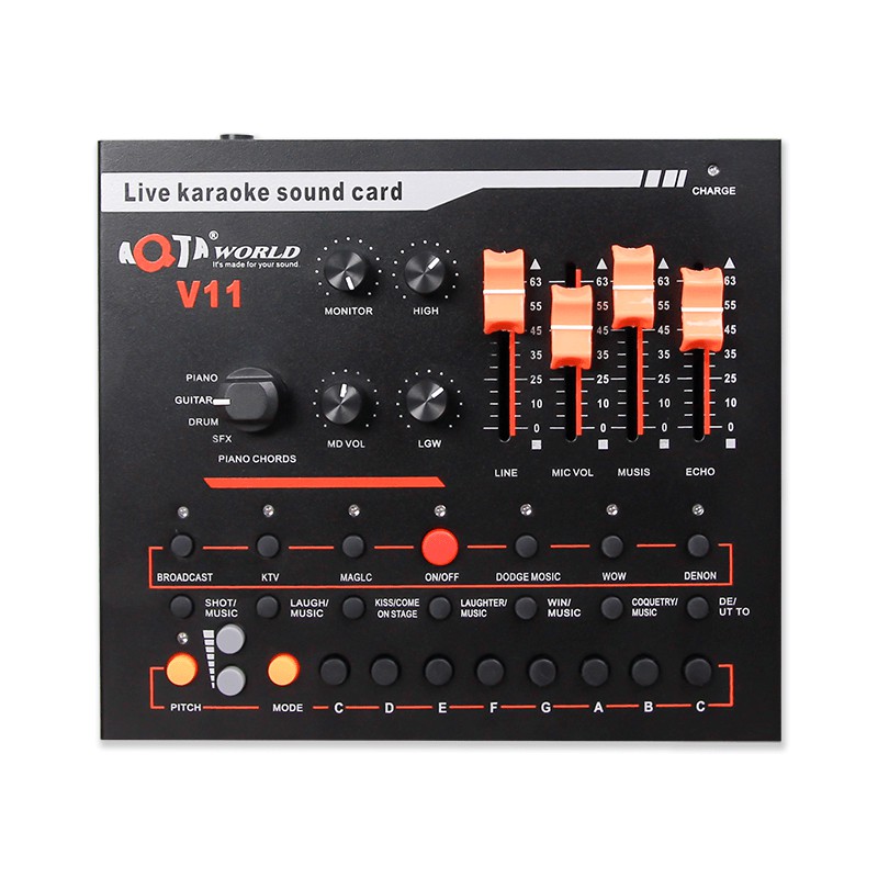 Sound card AQTA V11 là phiên bản hoàn toàn mới, được cải tiến rất nhiều so với các thế hệ sound card trước như V8, V9, V10. Sound card V11 được thiết kế cực kỳ đẹp mắt, tích hợp pin sạc hỗ trợ hiệu ứng âm thanh sống động, đi kèm rất nhiều tinh chỉnh âm thanh nhạc cụ khá hay chuyên dùng cho phòng thu âm, hát livestream, hát karaoke tại nhà.- THIẾT KẾ CHẮC CHẮN CÙNG KIỂU DÁNG BẮT MẮT