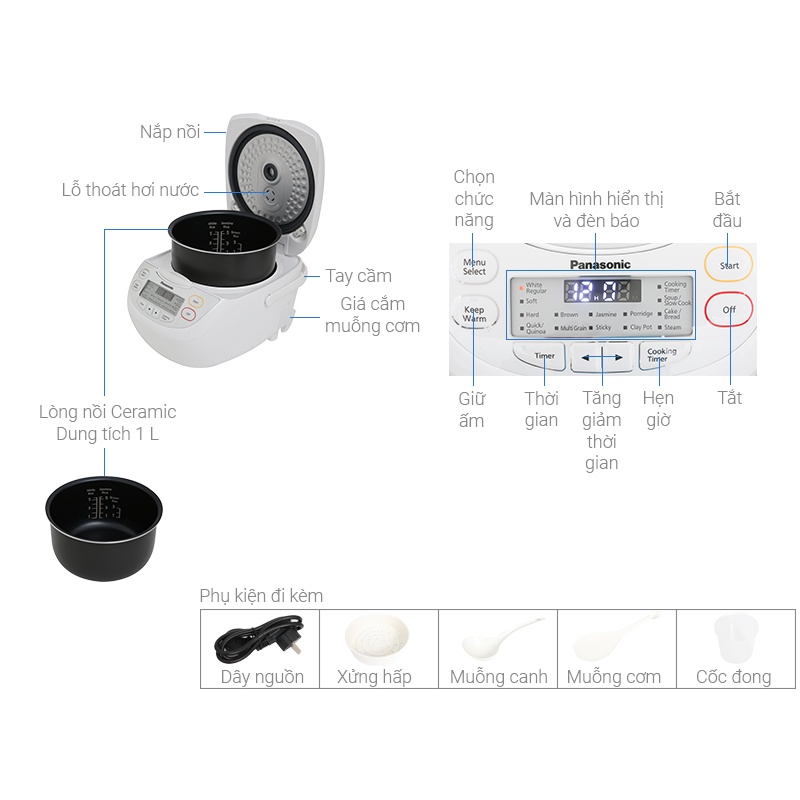 - Nồi cơm điện tử Panasonic 1 lít SR-CL108WRA màu trắng tinh xảo, nhỏ gọn với dung tích 1 lít, nấu cơm đủ cho gia đình có từ 2 - 4 thành viên dùng hằng ngày