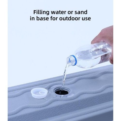 Chân đế của standee ngoài trời chống gió là bầu nhựa chứa nước nhằm tăng trọng lượng chân đế của sản phẩm, tạo độ vững cho khung khi có gió. trọng lượng tối đa chân đế khi có nước khoảng 12,5kg, thích hợp dùng tại những nơi có không gian rộng, hút gió. Khi không sử dụng, khung standee có thể tháo rời, gấp xếp lại rất gọn gàng, dễ di chuyển.