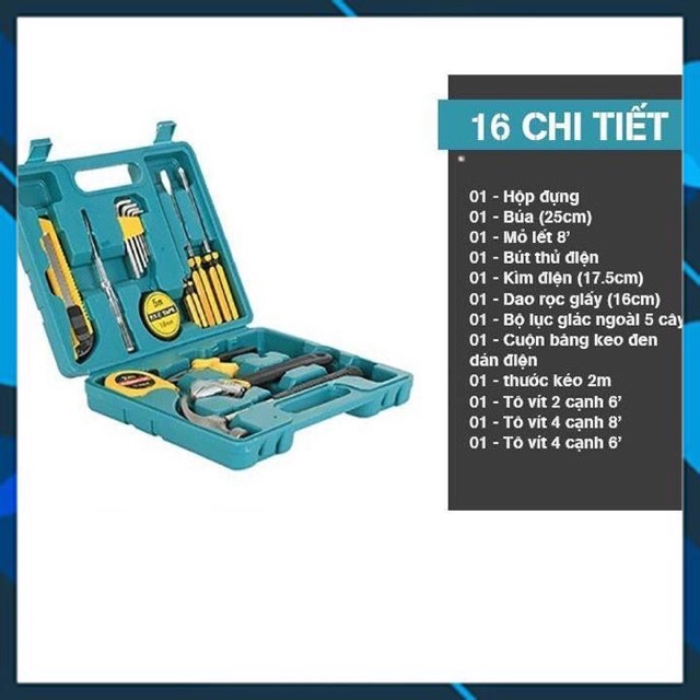 Nhà cửa & Đời sống > Dụng cụ & Thiết bị tiện ích > Dụng cụ > Hộp dụng cụ cầm tay || Bộ sửa chữa 16 chi tiếtCòn hàng