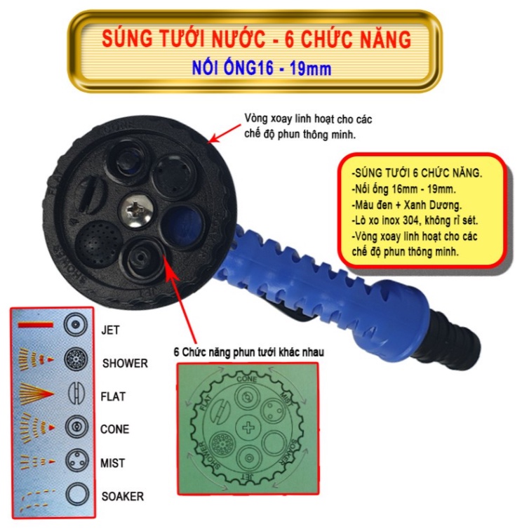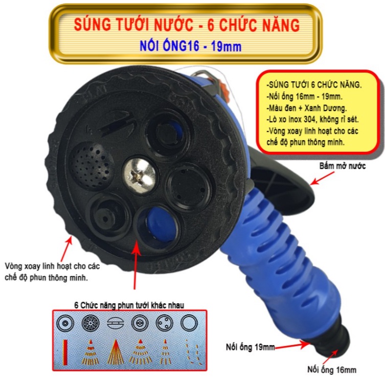 Súng tưới cây - rửa xe 6 chế độ phun nước sẽ giúp bạn thật tiện ích trong công việc làm vườn và dọn dẹp vệ sinh.Với 6 kiểu phun nước giúp cho bạn chọn lựa thích ứng cho mỗi công việc bạn mong muốn.