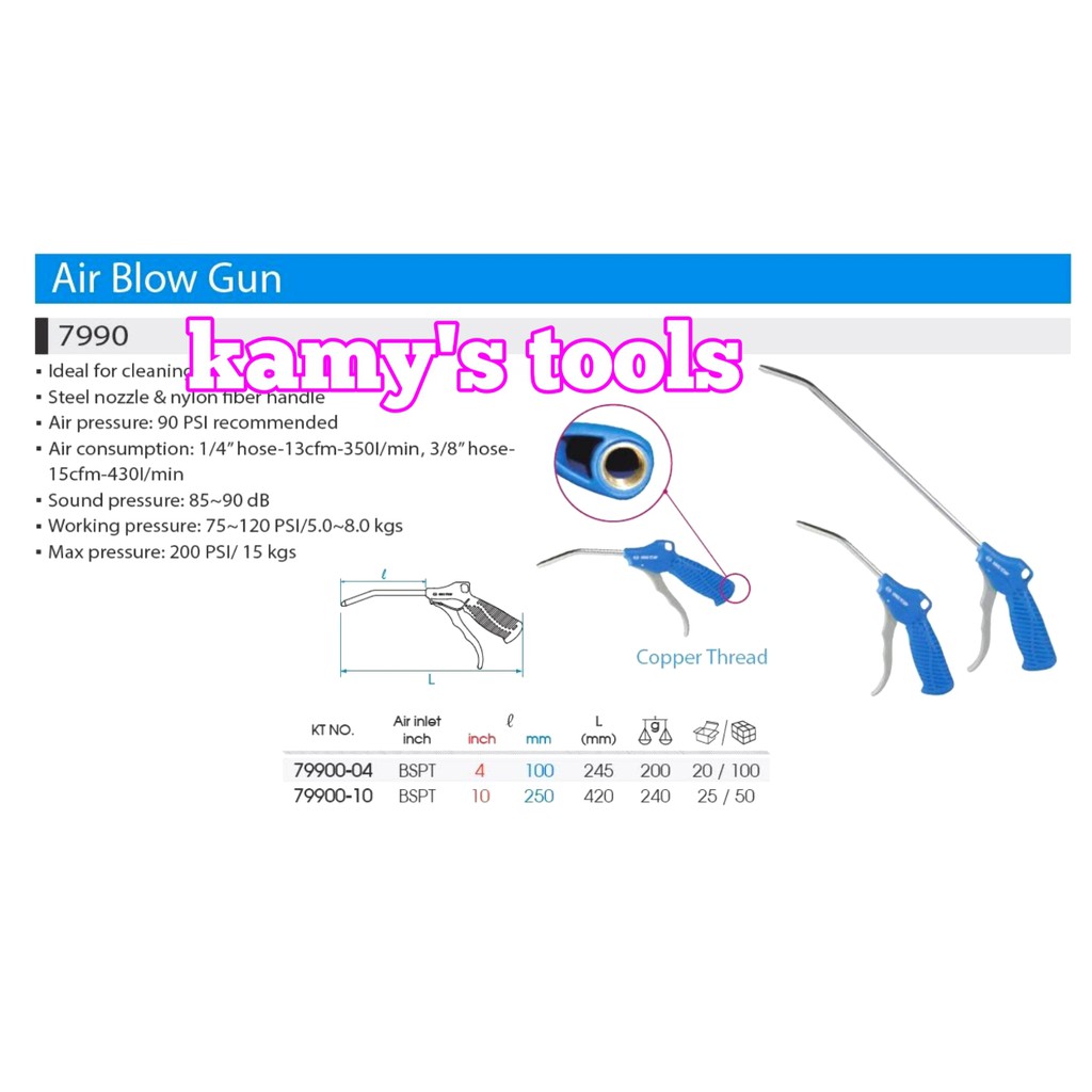 Súng xịt hơi xịt bụi Kingtony 100mm model 79900-04 và 250mm model 79900-10 sản xuất chính hãng tại đài loan chuyên dùng để xịt hơi xịt bụi vệ sinh máy móc trong khoan máy trong garage sửa chữa xe.Súng xịt hơi xịt bụi Kingtony model 79900-04 có chiều dài là 4" tương đương 100mm là độ dài của phần đầu vòi xịt, có chiều dài toàn bộ là 245mm.