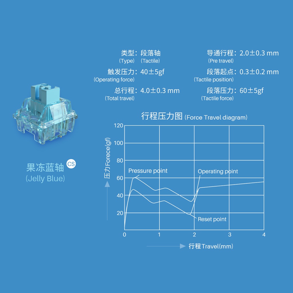 - Jelly Blue sở hữu công nghệ độc quyền dual tactile bump (khấc tactile thể hiện rõ khi bấm và nhả)