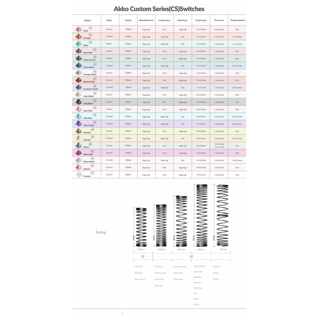 AKKO CS switch là một dòng switch custom do AKKO phát triển nhằm thỏa mãn đam mê trải nghiệm cảm giác gõ phím của người dùng. Một điểm khác biệt lớn nhất giữa AKKO CS switch và AKKO switch v2 là lò xo. Lò xo có biên độ dày hơn của AKKO CS switch hứa hẹn sẽ đem lại trải nghiệm độc đáo và khác biệt cho người dùng.Bộ switch AKKO CS (Jelly Black / Jelly Pink / Jelly Blue / Jelly White /Jelly Purple / Sakura / Crystal / Silver/Wine Red )