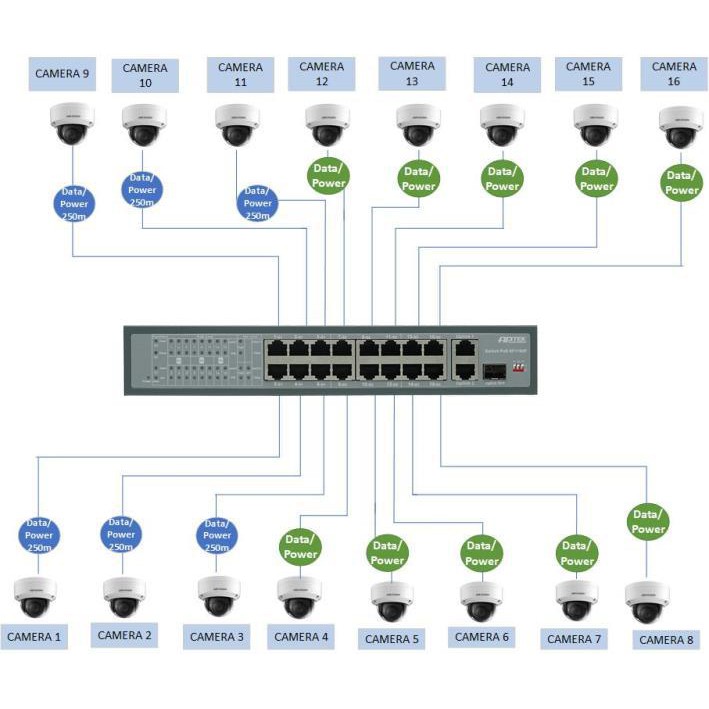 Tích hợp extended mode (CCTV mode): các port PoE cô lập với nhau, chỉ kết nối với port uplink, hỗ trợ truyền tín hiệu và nguồn với khoảng cách 250m. Tốc độ truyền dữ liệu tối đa của các port PoE khi chọn mode extended là 10 Mbps.