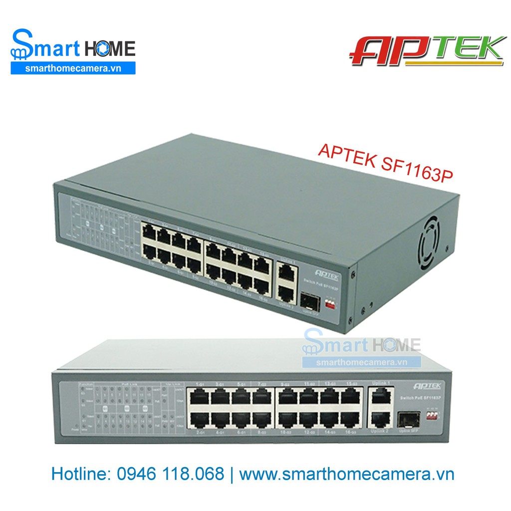 Switch PoE APTEK SF1163P gồm 2 cổng UPLINK Gigabits và 1 cổng UPLINK SFP.