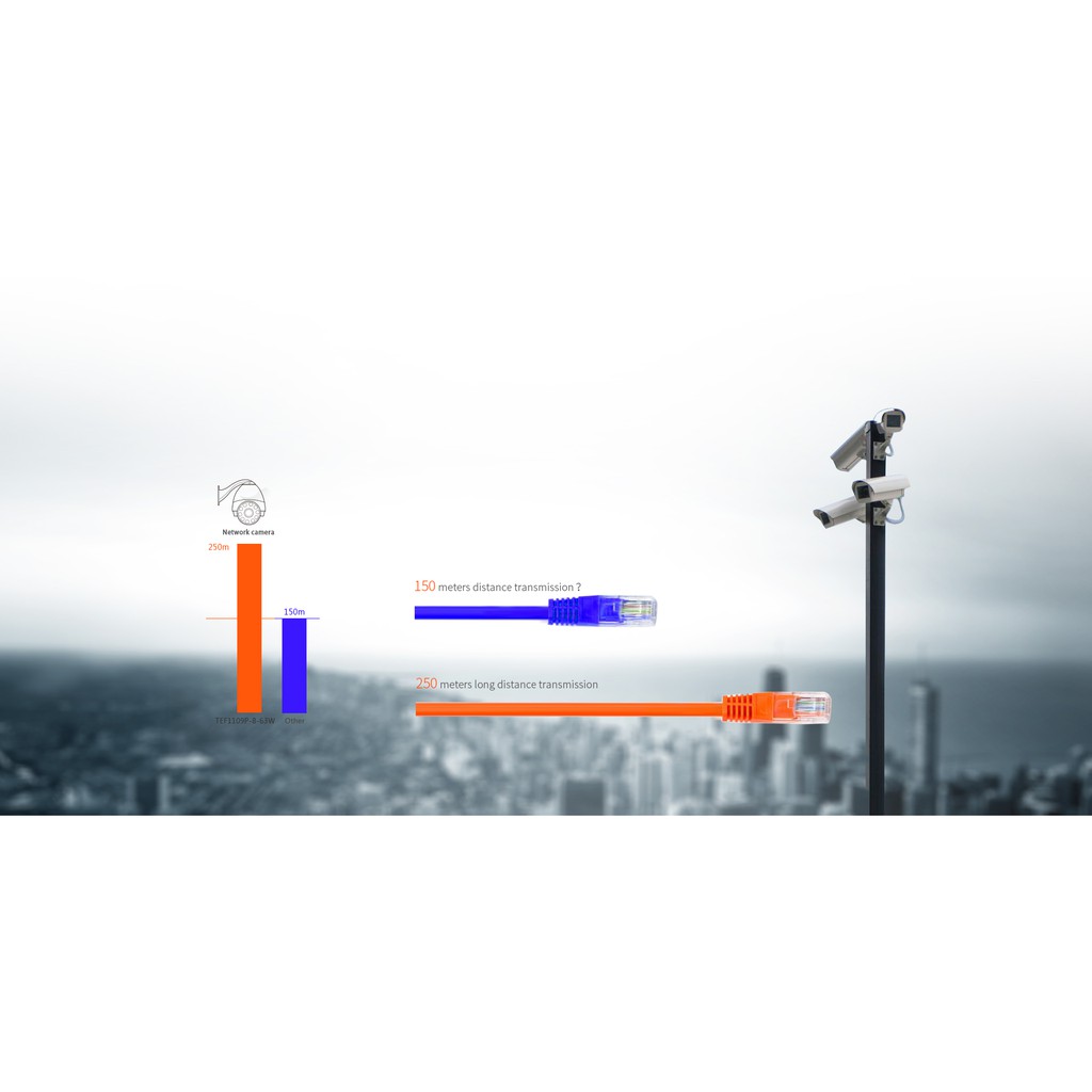 Do môi trường giám sát phức tạp, khi làm cáp và kết nối mạng, rất thường gặp phải vấn đề về khoảng cách truyền dẫn mạng không đầy đủ, khoảng cách của mỗi camera thiết bị đầu cuối đến trung tâm giám sát khác nhau, một số chỉ vài mét cho đến vài trăm mét, thậm chí xa hơn cả cây số. Tenda Switch PoE TEF11 giám sát, độc quyền sáng chế công nghệ mở rộng mạng, sử dụng cặp xoắn phổ biến hiện có, có thể hỗ trợ truyền dữ liệu 250 mét, phá vỡ giới hạn truyền dẫn hiện tại hàng trăm mét.