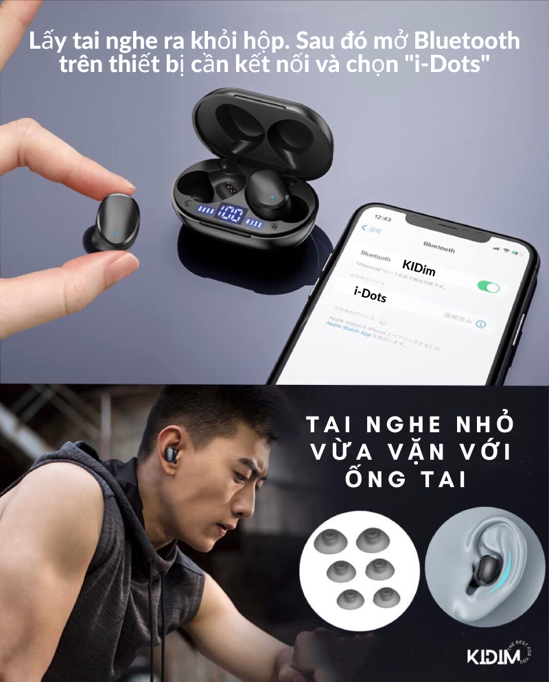 - Hướng dẫn kết nối: lấy tai nghe ra khỏi hộp. Sau đó mở Bluetooth trên thiết bị cần kết nối và chọn "i-Dots".