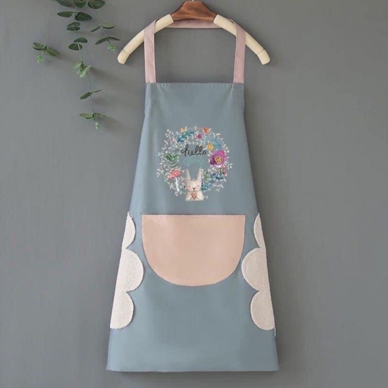 Tạp dề chống nước hình thỏmàu sắc xanh và hồng pastel rất xinh, hoạ tiết hoa thỏ dễ thương cực kỳ.