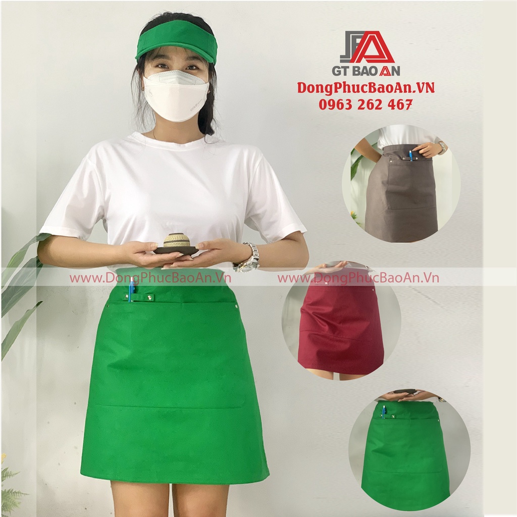 - Quy cách: Tạp dề ngắn, có 2 dây cột sau 70cm, có 2 túi đựng phía trước đựng sổ order hoặc vật dụng cần thiết và có vắt bút
