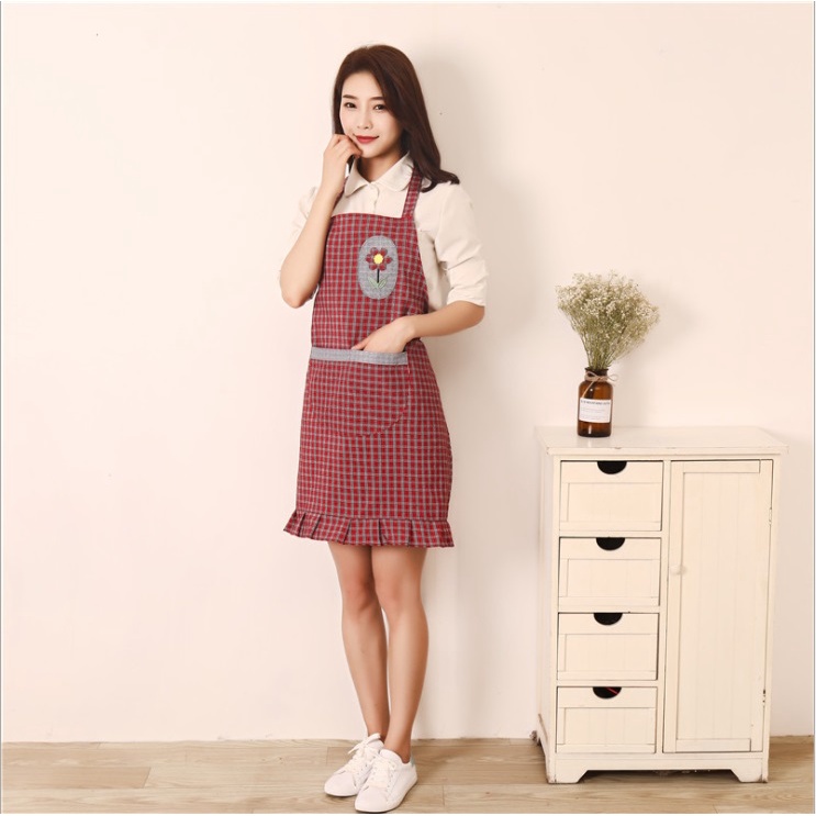 Giới thiệu Tạp dề vải kẻ caro viền nhún bèo phong cách Hàn Quốc dáng chữ nhật [TD002]
