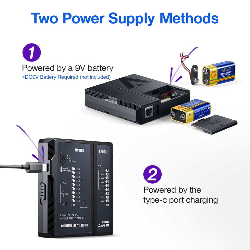 Bộ test mạng AMPCOM hỗ trợ nguồn 9V, cổng sạc Type C