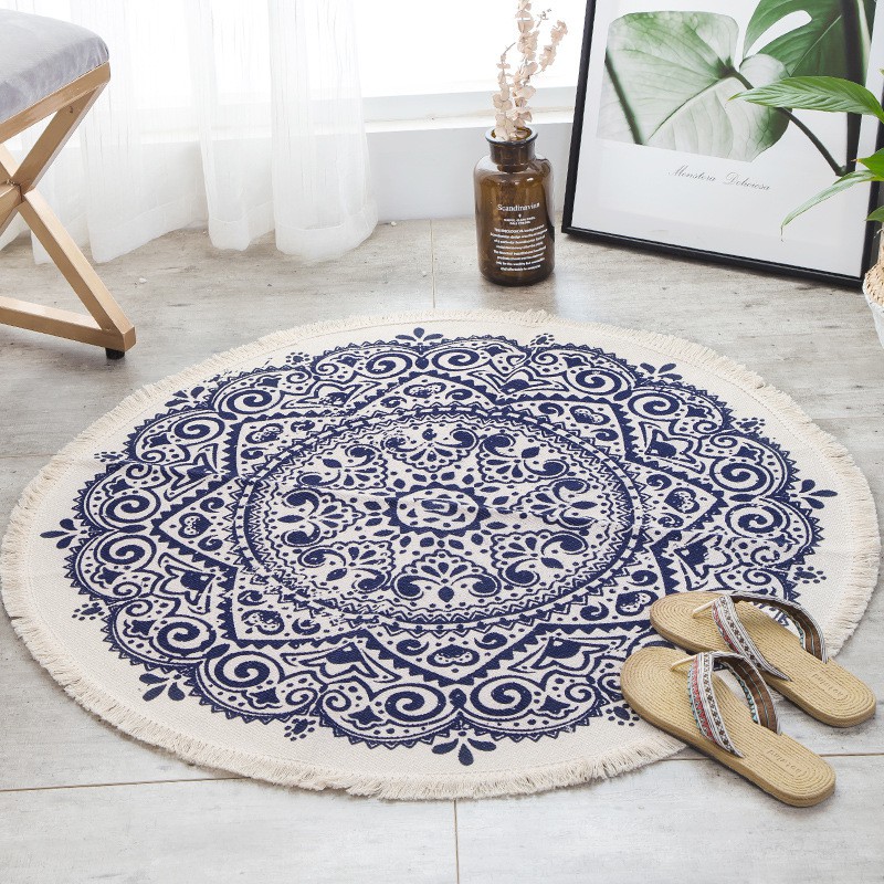 Thảm Canvas Tròn Tua Rua Scadivian Thổ Cẩm trang trí được in màu trên lớp vải canvas sang trọng, hai bên phối tua rua tạo nên không gian sống vô cùng vintage và cá tính.Thảm Canvas Tròn Tua Rua Scadivian Thổ Cẩm với kích thước đường kính 92cm và 120cm tiện dụng để ở cửa ra vào, dưới chân giường ngủ, ghế sofa hay cả trải lót ở khu vực nhà tắm. Với nhiều hình họa tiết đáng yêu là vật dụng trang trí vô cùng ấn tượng.