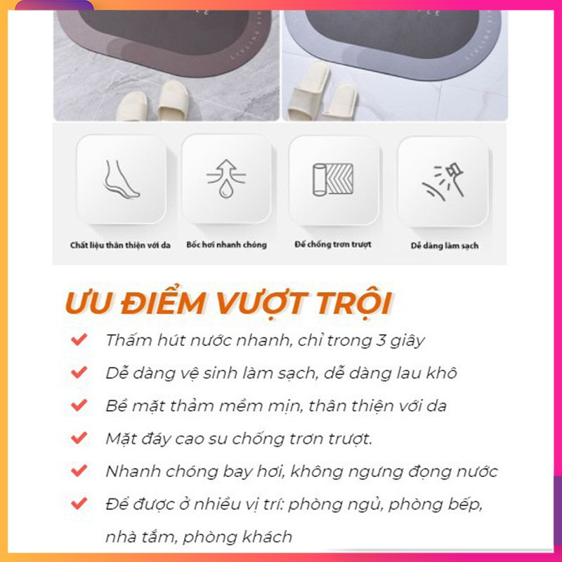 ✔️Không trơn trượt, an toàn cho người già và trẻ nhỏ. Vật liệu Diatomite với những lỗ siêu nhỏ có khả năng tự thấm, hút ẩm siêu nhanh và ngay lập tức giải phóng lượng ẩm này vào không khí.