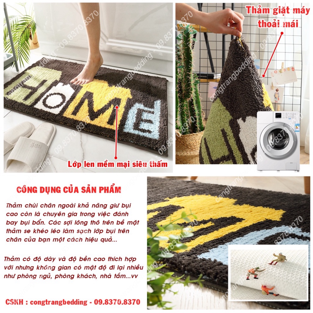 * Chất liệu: thảm chùi chân có mặt trên là lớp vải len dày, êm, mềm mịn có khả năng thấm hút nước khá tốt