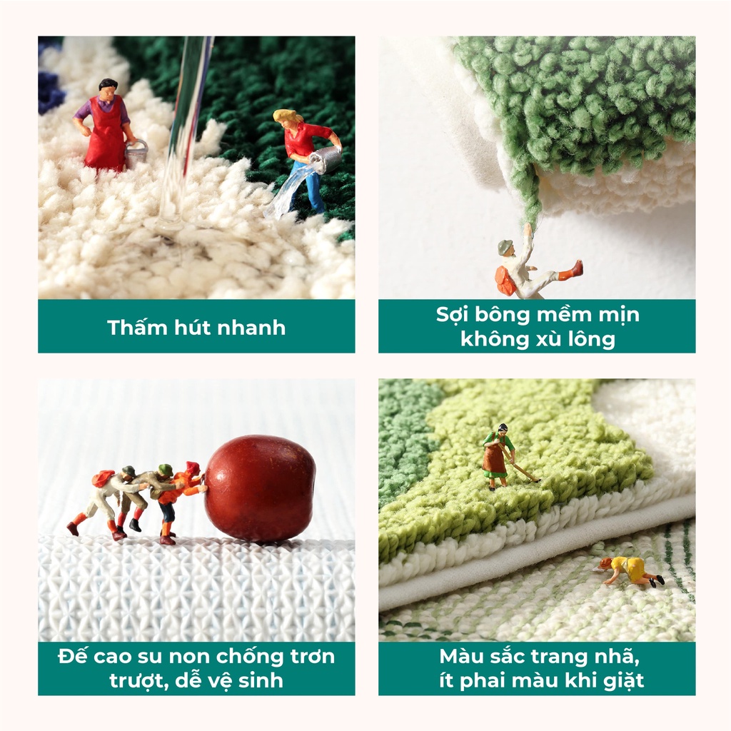 - Đa dạng công năng sử dụng: Thảm chùi chân, thảm lau, thảm nhà tắm, phòng ngủ, thảm phòng bếp.