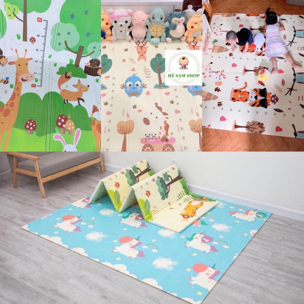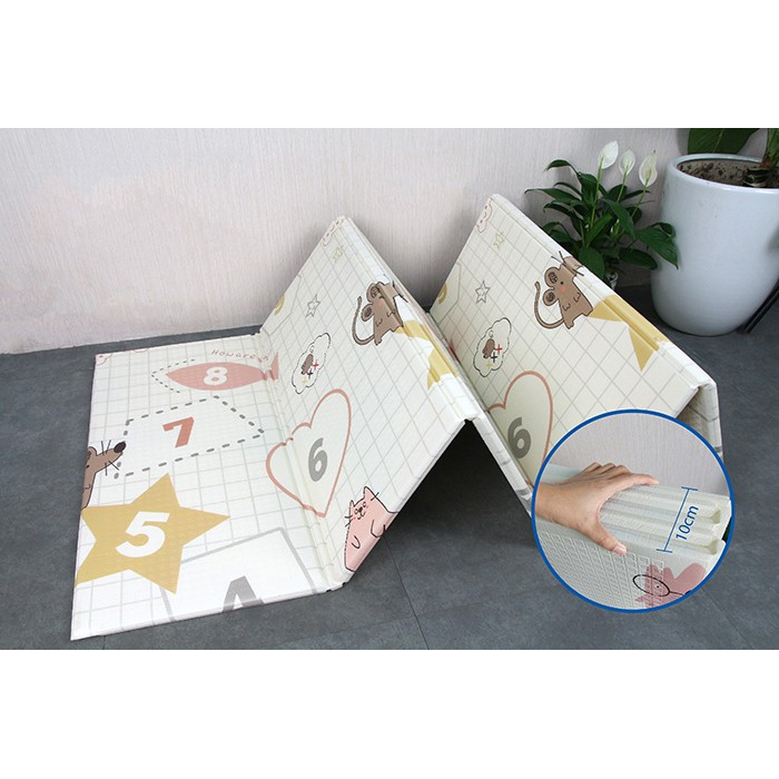 Tấm thảm có kích thước lớn , với độ dày 1 cm, sử dụng vật liệu xốp XPE cao cấp, không mùi, không độc hại, mềm mại, êm ái và chống trơn trượt hiệu quả.Thiết kế thông minh khi 2 mặt đều có thể sử dụng như nhau, đặc biệt có các nếp gấp để bố mẹ dễ dàng xếp gọn để cất giữ hoặc mang theo tiện lợi trong