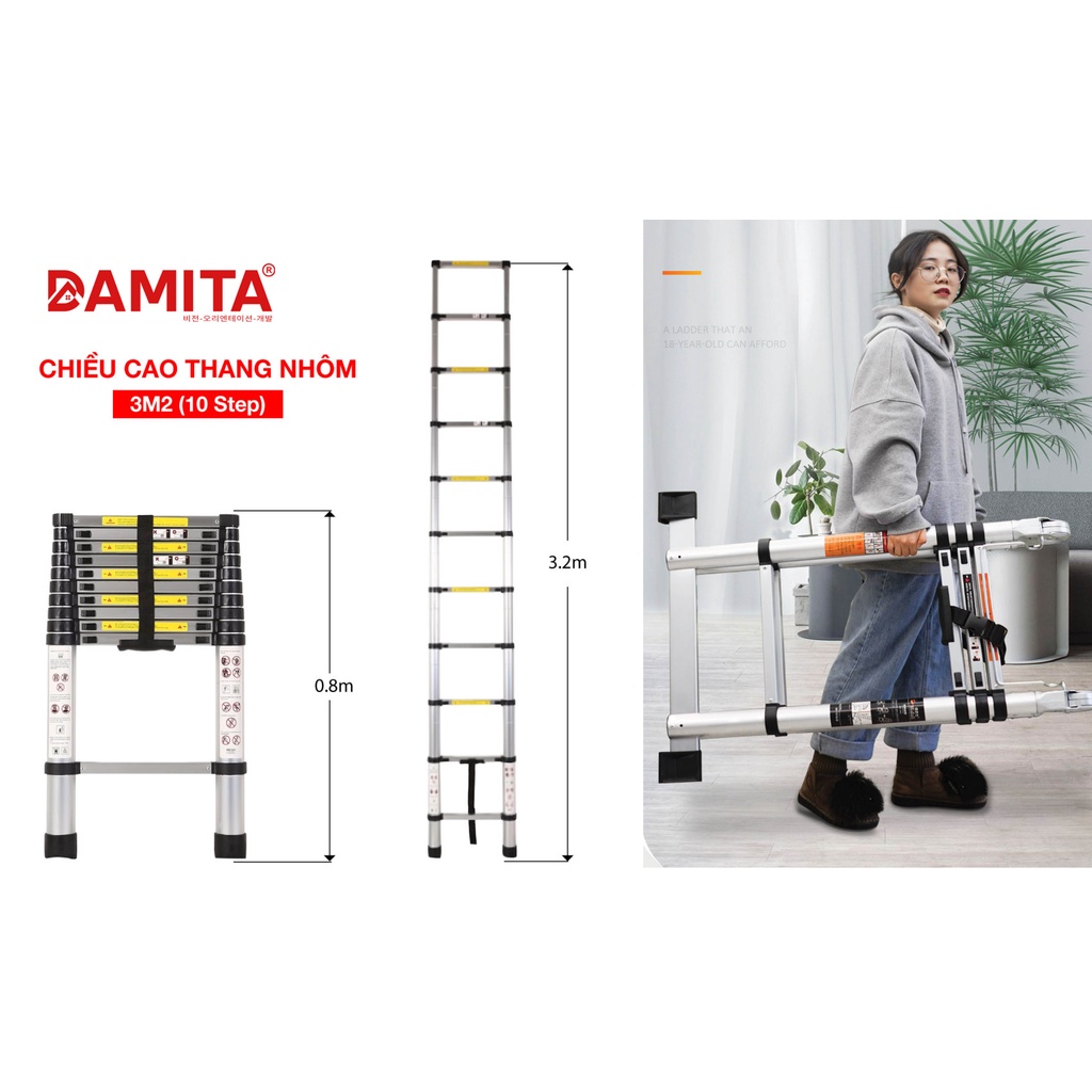 ☑️ Thang nhôm rút đơn DAMITA Hàn Quốc được cấu thành từ nhôm (hợp kim nhôm) đảm bảo độ chắc chắn trong suốt quá trình sử dụng và chống lại sự oxy hoá khi tiếp xúc với môi trường bên ngoài.