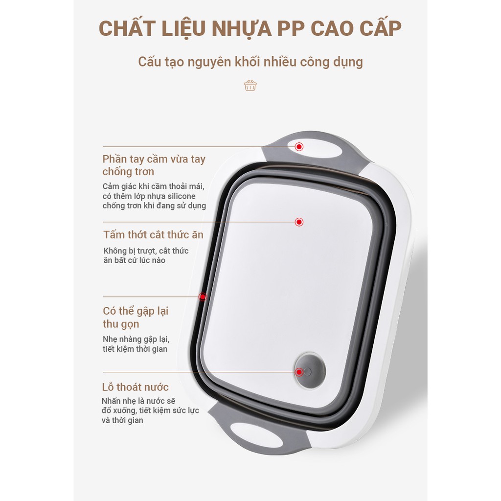 Thau chậu kèm thớt 2 trong 1, có thể gập lại làm tấm thớt, mở rộng ra sẽ thành thau chậu rửa rau quả, chất liệu cao cấp