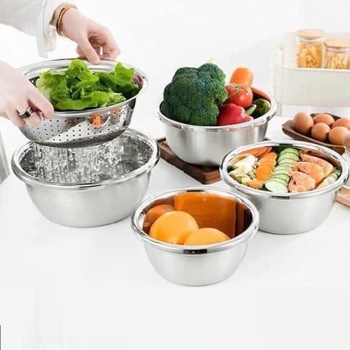 c🍒Sét 5 món 1 rổ + 4 chậu inoxBộ 5 tô inox các cỡ từ to đến nhỏ, cứ hàng thủy tinh với inox mà dùng thôi cho nó an toàn.