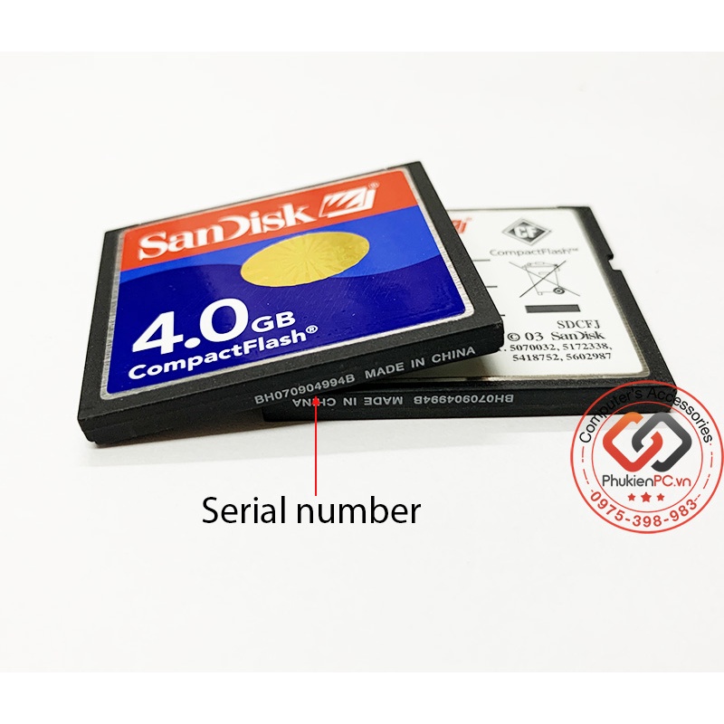 Thẻ nhớ CF chính hãng SanDisk luôn có in serial number (SN) bên dưới thẻ. Nét in, font chữ rõ ràng