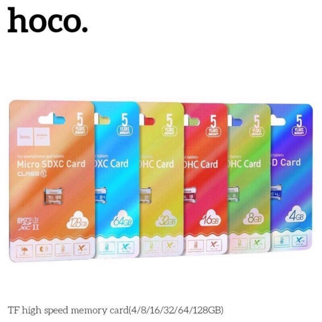 Hoco mới đây đã công bố dòng thẻ nhớ SD/microSD mới nhãn in mới có màu sắc trẻ trung và ấn tượng hơn. Được dựa trên các sản phẩm trước đó, các dòng thẻ nhớ mới của Hoco sẽ phân loại dung lượng thông qua màu sắc (Màu xanh lam: 4Gb, Xanh Lục: 8Gb, Đỏ đậm: 16Gb, Vàng: 32Gb, Xanh nước biển: 64Gb và màu Cam: 128Gb). Đạt chuẩn Class10, UHS-1 cho tốc độ truy xuất lên đến 80-90MB/s.
