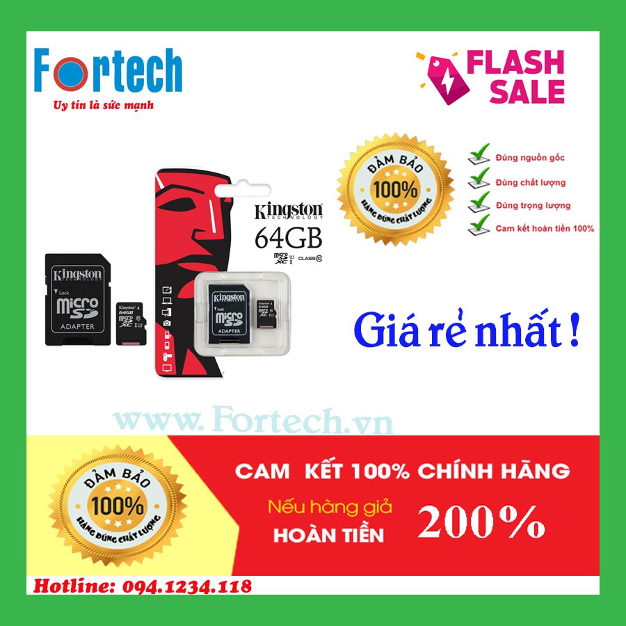 Điện Thoại & Phụ Kiện > Phụ kiện > Thẻ nhớ || Thẻ nhớ micro SD Kingston Class10 64GB - Chính hãng FPTCòn hàng