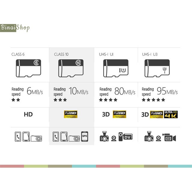 - Thẻ nhớ UHS-I Class 1 (từ 8GB đến 32GB) có tốc độ đọc lên tới 40MB/s, tốc độ ghi lên tới 15MB/s.