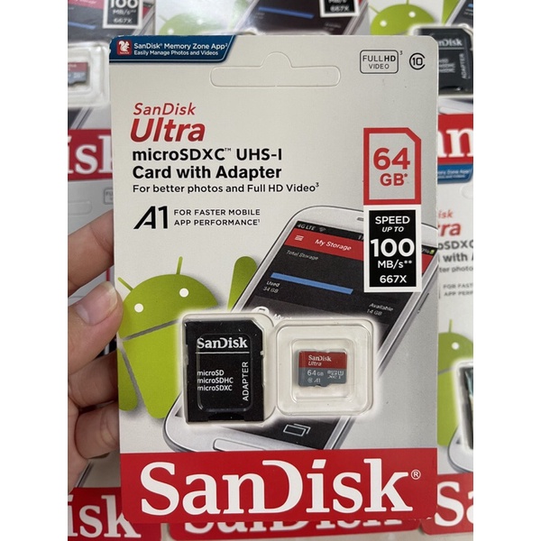 Thẻ nhớ MicroSD SanDisk 64Gb 100MB/s cho phép bạn lưu giữ, truyền tải hình ảnh có độ phân giải cao và video Full HD trên điện thoại thông minh Android hoặc máy tính bảng của bạn. Với dung lượng lên đến 64 GB, thẻ nhớ MicroSD SanDisk 64Gb 100MB/scó thẻ lưu trữ rất nhiều album hình ảnh độ phân giải cao và quay video Full HD. Với tốc độ chuẩn Class 10 để quay video Full HD và tốc độ đọc lên đến 100MB/s để chuyển file cực nhanh