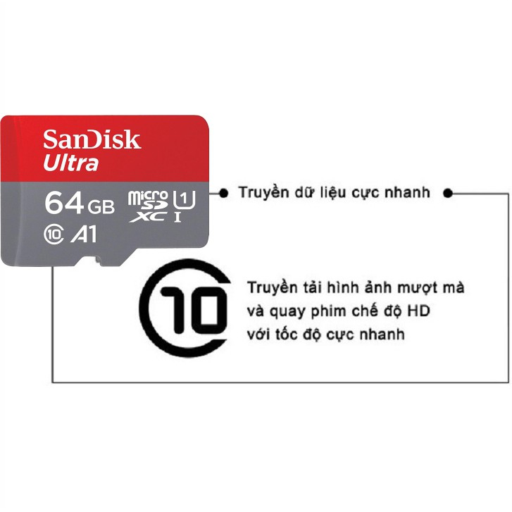 - Thẻ nhớ MicroSDHC 64GB Sandisk Ultra giúp bạn có rất nhiều không gian để lưu trữ hình ảnh và video của bạn.