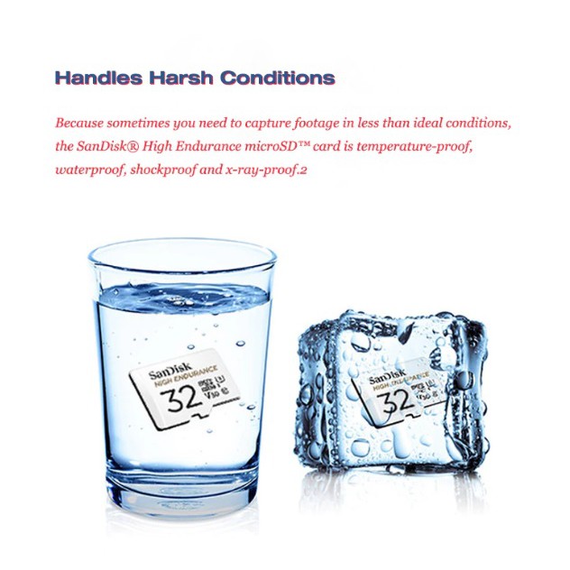 Vì đôi khi bạn cần phải ghi lại các cảnh quay trong điều kiện không lý tưởng, thẻ SanDisk High Endurance microSD ™ có khả năng chống nhiệt độ, chống thấm nước, chống sốc và chống tia X.