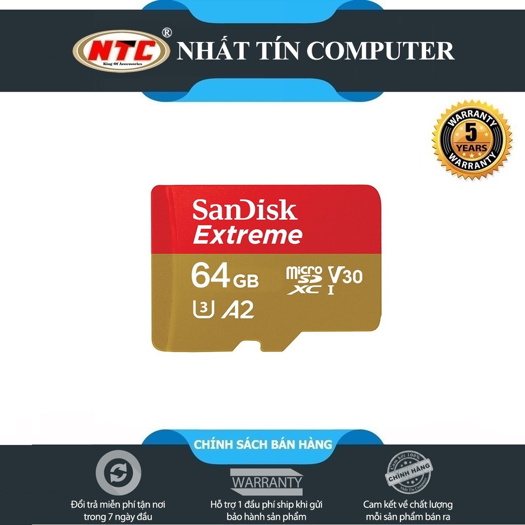 Thẻ Nhớ MicroSDXC SanDisk Extreme 64GB V30 U3 4K A2 R160MB/s W60MB/s (Vàng) - No AdapterThẻ nhớ với tốc độ ghi cực nhanh cho phép chụp hình và quay Video Full HD, 4k dành cho điện thoại thông minh Android, máy ảnh MIL, hoặc GoPro Hero3, Hero3 +, Hero4, và Hero +. Thẻ nhớMicroSDSanDisk Extreme V30 A2 được thiết kế đặc biệt có thể tồn tại ngay cả trong điều kiện môi trường khắc nghiệt nhứt. Tốc độ nhanh cho phép bạn chụp rõ từng chi tiết và giúp di chuyển dữ liệu cực nhanh. Với dung lượng lên đến 64GB giúp mở rộng bộ nhớ điện thoại của bạn và hỗ trợ quay phim 4K chất lượng cao.