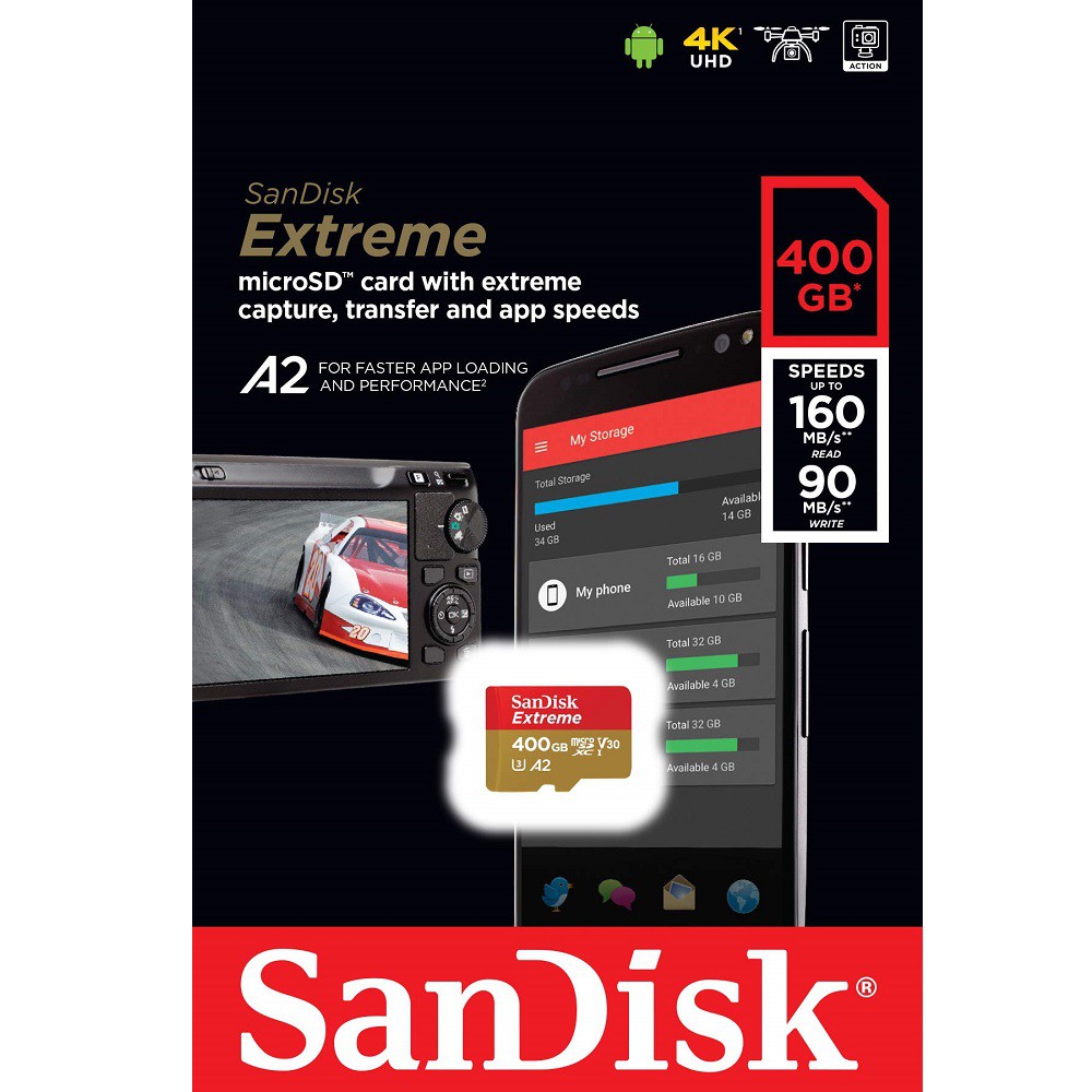 Thẻ Nhớ MicroSDXC SanDisk Extreme 400GB V30 U3 4K A2 R160MB/s W90MB/s (Vàng) - No AdapterThẻ nhớ với tốc độ ghi cực nhanh cho phép chụp hình và quay Video Full HD, 4k dành cho điện thoại thông minh Android, máy ảnh MIL, hoặc GoPro Hero3, Hero3 +, Hero4, và Hero +. Thẻ nhớ MicroSDXC SanDisk Extreme V30 A2 được thiết kế đặc biệt có thể tồn tại ngay cả trong điều kiện môi trường khắc nghiệt nhứt. Tốc độ nhanh cho phép bạn chụp rõ từng chi tiết và giúp di chuyển dữ liệu cực nhanh. Với dung lượng lên đến 256GB giúp mở rộng bộ nhớ điện thoại của bạn và hỗ trợ quay phim 4K chất lượng cao.