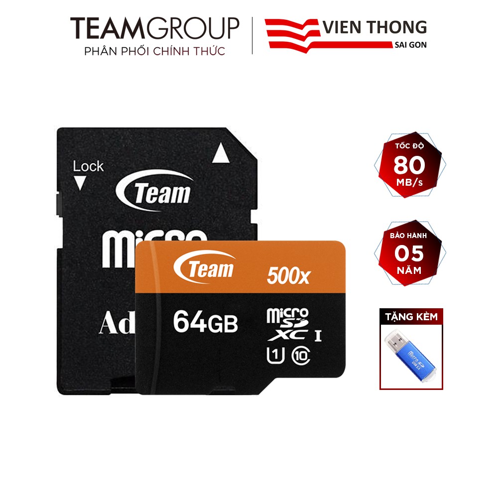 Thẻ nhớ microSDXC Team 64GB 500x upto 80MB/s C10 UHS-I kèm Adapter (Cam) tặng đầu đọc thẻ