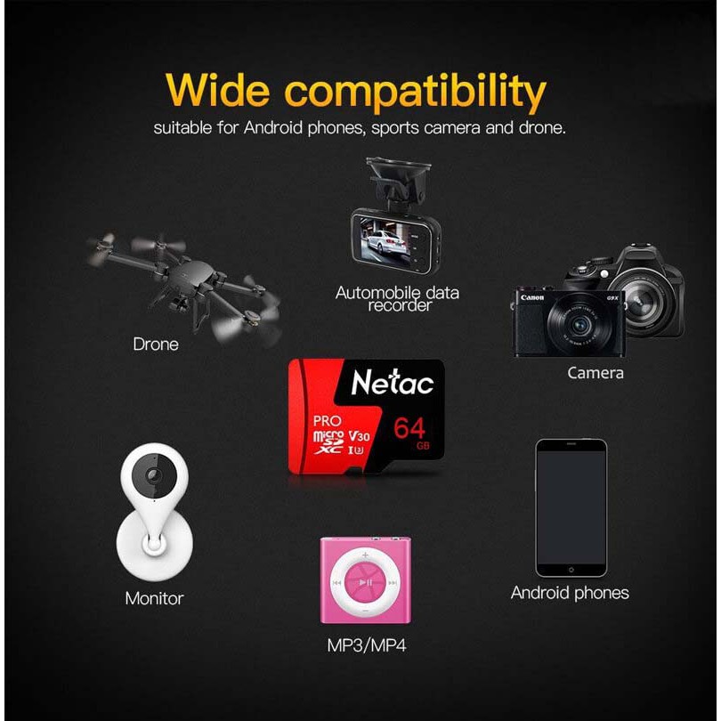 - Thẻ nhớ MicroSDHC Netac Ultra 64GB U3 Pro là thẻ nhớ dùng cho camera, điện thoại, có tốc độ đọc ghi cực nhanh với chuẩn MicroSDHC, tương thích với mọi thiết bị như điện thoại thông minh, máy tính bảng và máy ảnh được TCS phân phối chính hãng...
