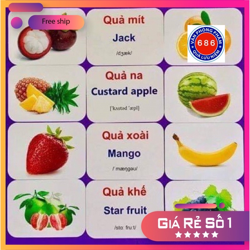 Thẻ 02 MẶT (1 mặt là hình ảnh, một mặt là chữ song ngữ Anh - Việt có phiên âm tiếng Anh, riêng chủ đề chữ số mặt sau là tiếng Anh kèm hình cho bé tô màu),
