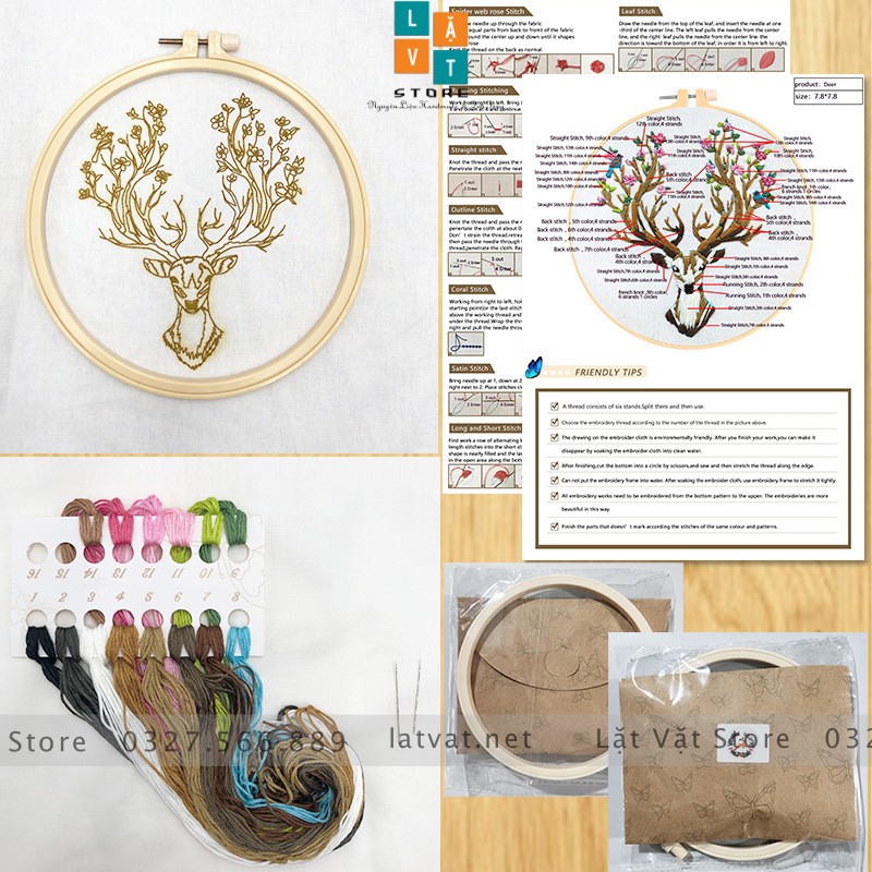 Tất cả bộ dụng cụ bao gồm: vải thêu, thẻ chỉ thêu, căng thêu, giải thích vẽ, kèm theo video hướng dẫn, kim thêu