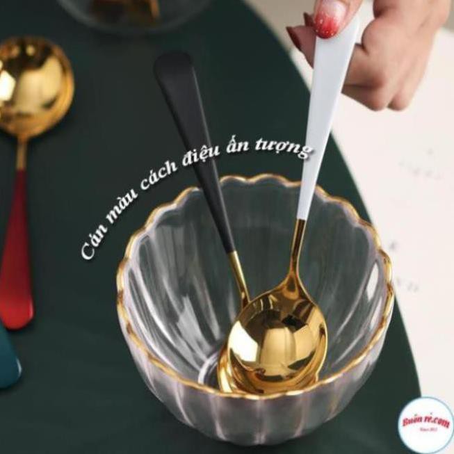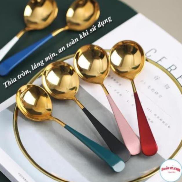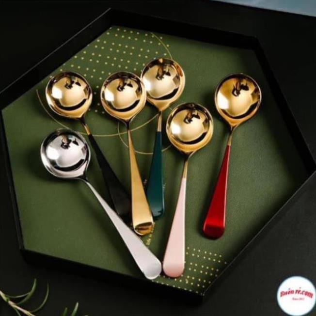 ✔️ Thìa Inox Mạ Vàng Cán Dài Nhiều Màu Với thiết kế tròn, rộng phù hợp khuôn miệng, dễ dàng xúc cơm, soup, cháo...