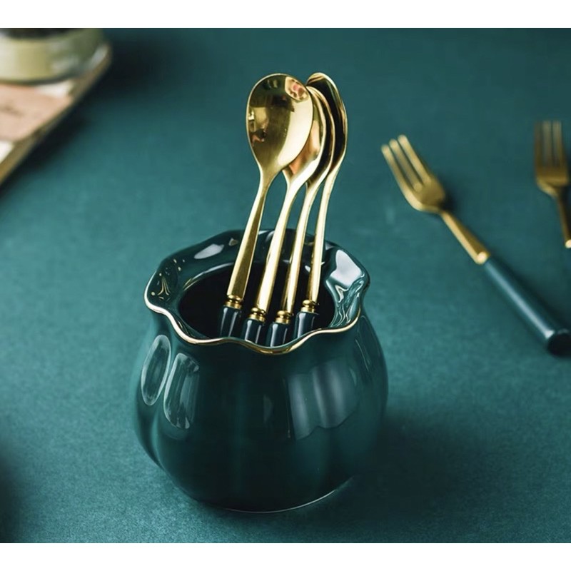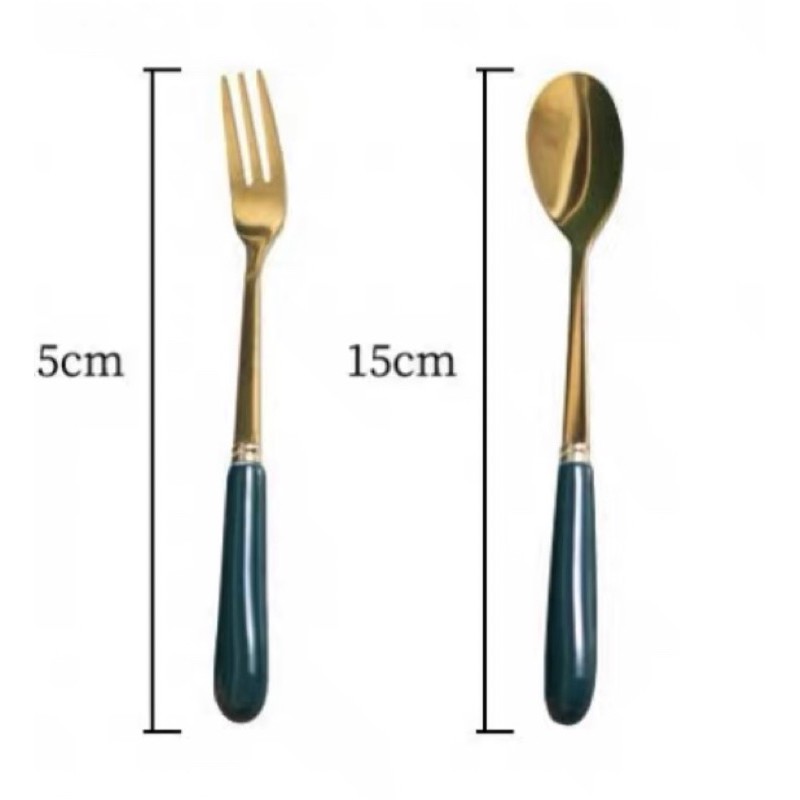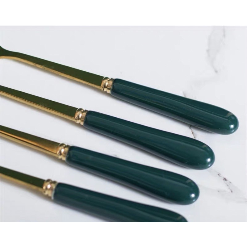 Nhà cửa & Đời sống > Bộ đồ bàn ăn > Bộ dao kéo || thìa cà phê vàng cán sứ xanh cổ vịt mẫu mới cao cấpCòn hàng