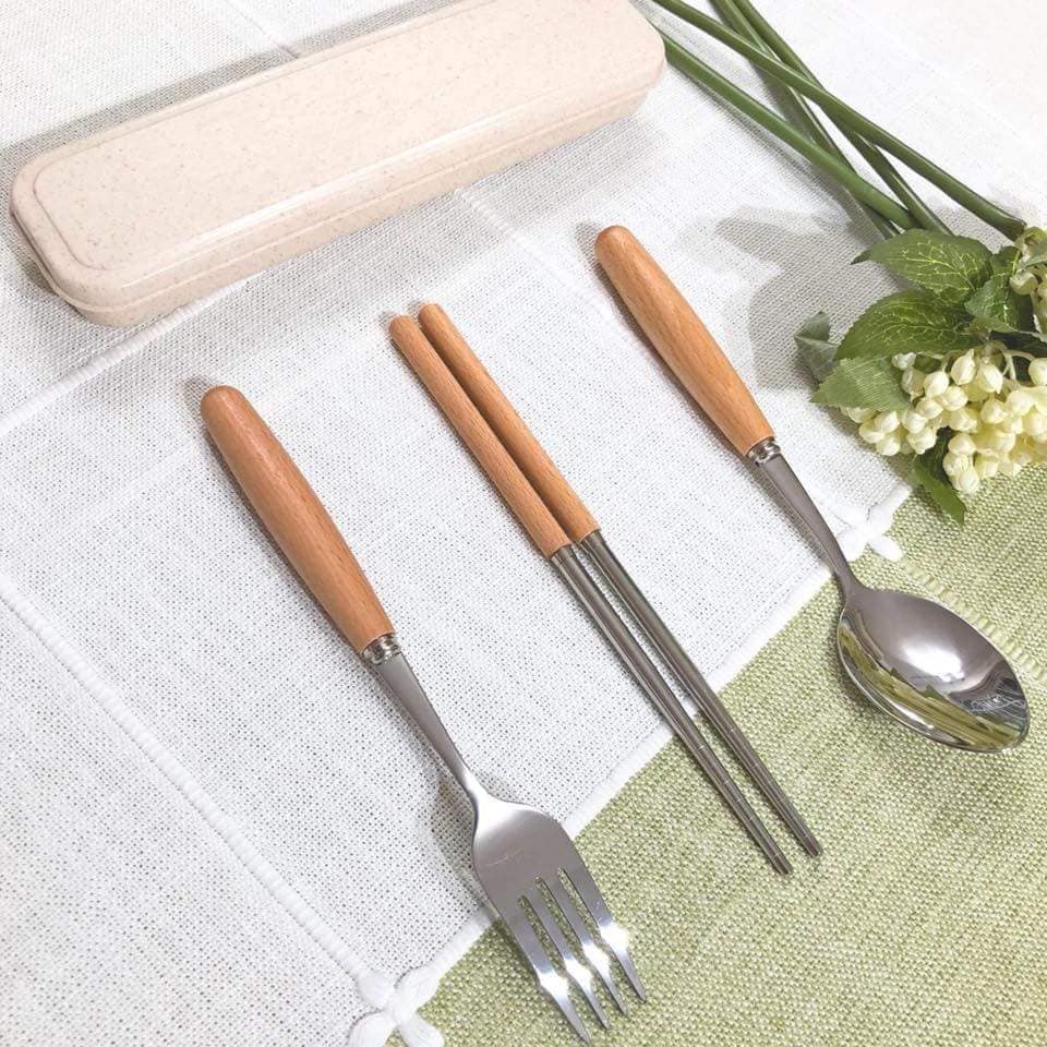 Giới thiệu Bộ thìa dĩa đũa cầm tay gỗ sồi / sét ba chi tiết