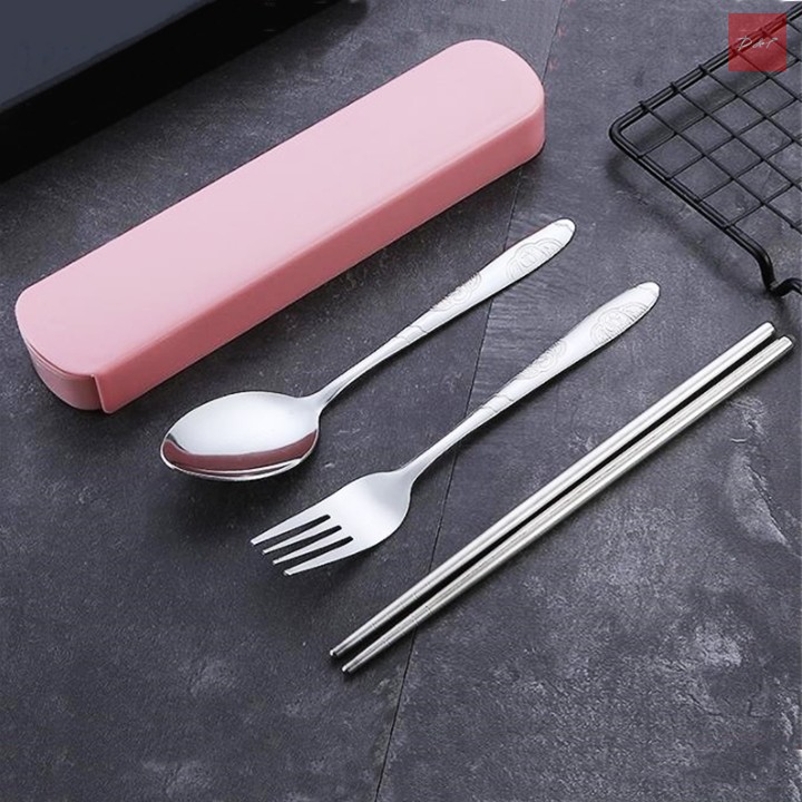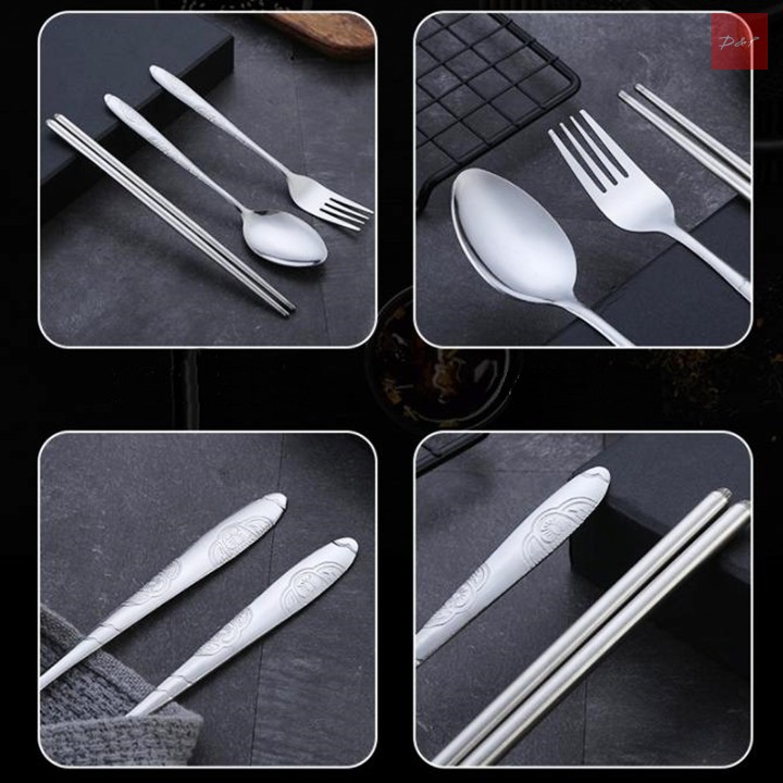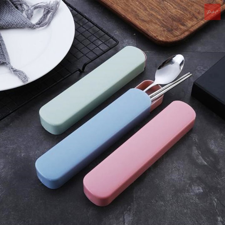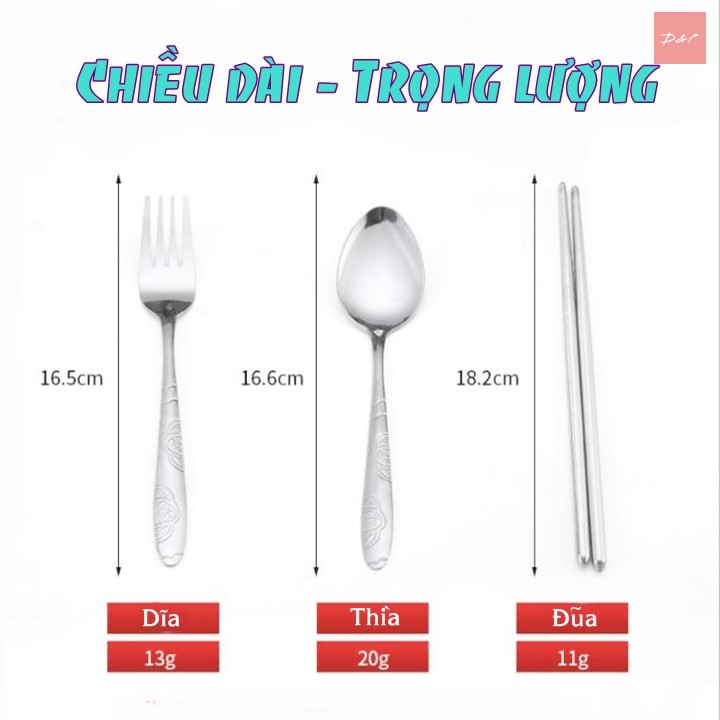 - Chất liệu: Muỗng, đũa, dĩa bằng thép không gỉ, hộp bằng nhựa PP