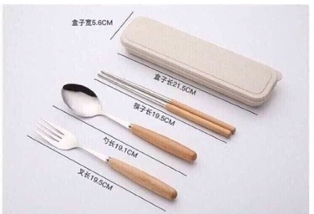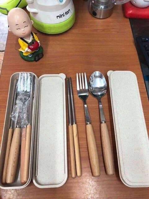 - Bộ gồm đũa, thìa và dĩa inox rất đẹp cán gỗ sồi, đựng trong 1 hộp nhựa lúa mạch sang trọng. Dùng mang cơm đi làm, mang đi du lịch hay picnic tiện lợi.